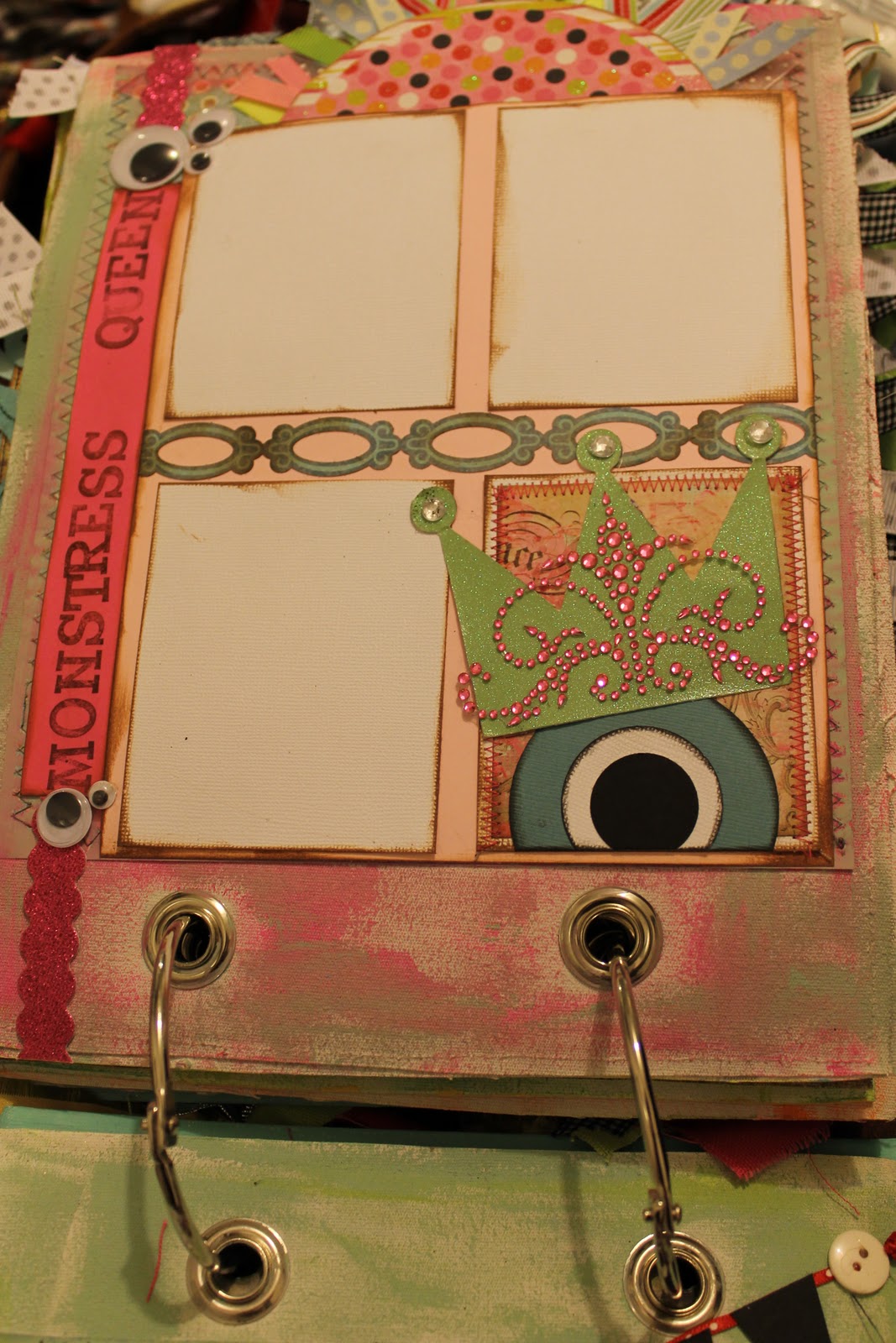 I have taken some pictures of what the inside looks like. I love the style of the album since she made the edges look worn and added lots of embellishments such as "monster" eyes, glitter, clips, ribbons, etc.